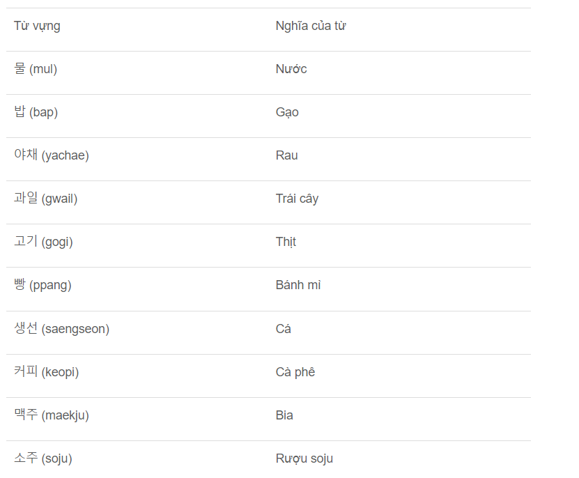 2. Từ vựng tiếng Hàn chủ đề đồ ăn: