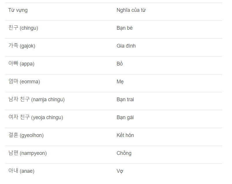 3. Từ vựng tiếng Hàn chủ đề gia đình và các mối quan hệ: